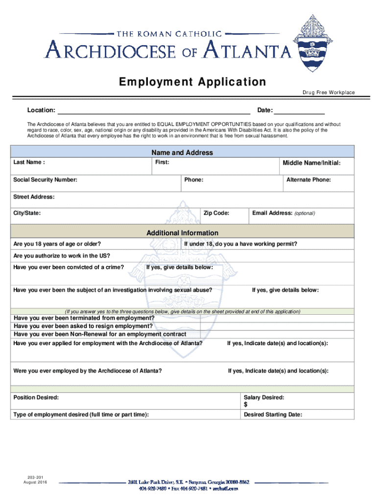 Employment Application Drug Free WorkplaceLocation:Date:The Archdiocese of Atlanta believes that you are entitled to EQUAL EMPLOYMENT OPPORTUNITIES based on your qualifications and without regard