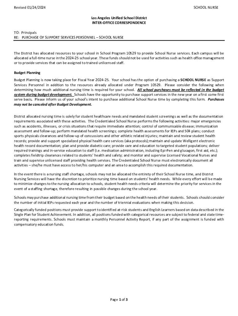 Revised 01/24/2024SCHOOL NURSE Los Angeles Unified School District INTEROFFICE CORRESPONDENCETO: Principals RE: PURCHASE OF SUPPORT SERVICES PERSONNEL SCHOOL NURSEThe District has allocated resources