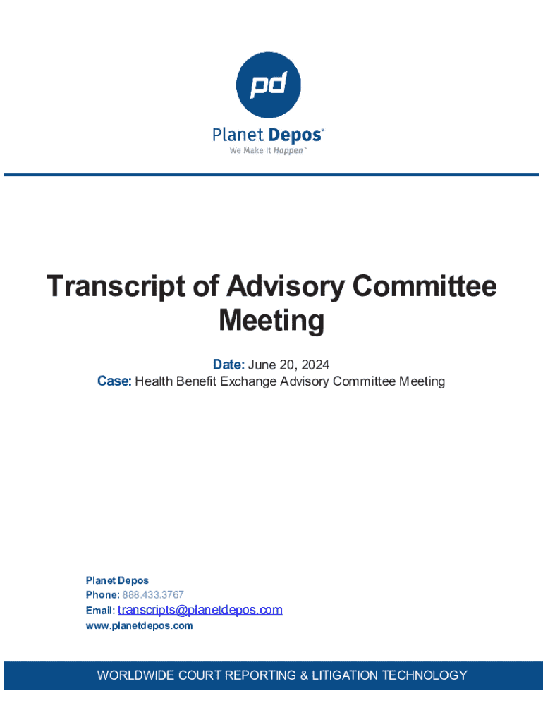 Transcript of Advisory Committee Meeting Date: June 20, 2024 Case: Health Benefit Exchange Advisory Committee MeetingPlanet Depos Phone: 888.433.3767 Email: transcripts@planetdepos.com www.planetdepos.comWORLDWIDE