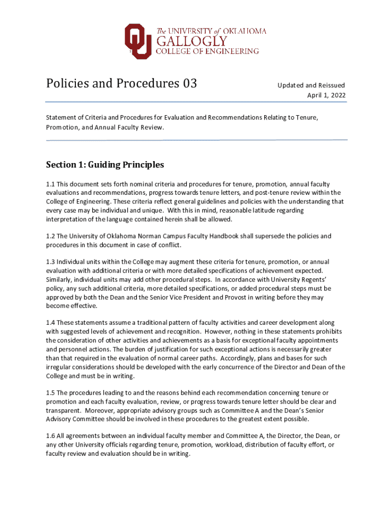 Policies and Procedures 03Updated and Reissued April 1, 2022Statement of Criteria and Procedures for Evaluation and Recommendations Relating to Tenure, Promotion, and Annual Faculty Review. Section