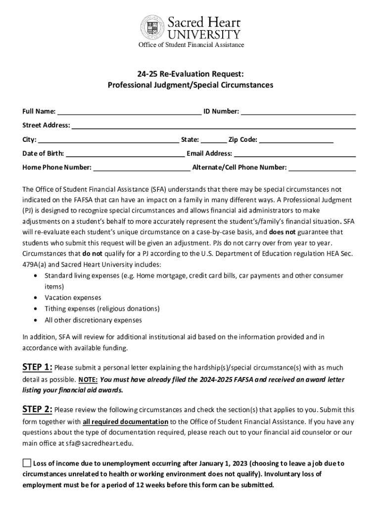 Office of Student Financial Assistance2425 ReEvaluation Request: Professional Judgment/Special Circumstances Full Name:ID Number:Street Address: City: Date of Birth: Home Phone Number:State:Zip Code:Email