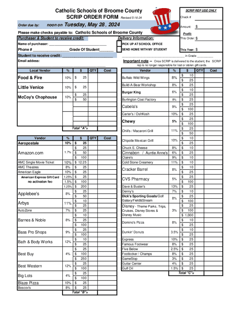 Amount:Please make checks payable to: Catholic Schools of Brooke