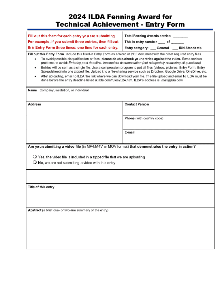 2021 I2024 ILDA Fenning Award for Technical Achievement Entry Form Fill out this form for each entry you are submitting.Total Fenning Awards entries: ___For example, if you submit three entries, then