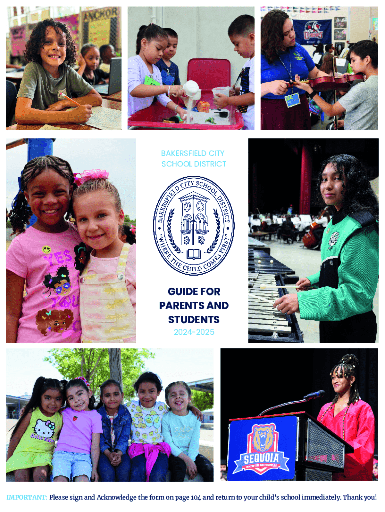 BAKERSFIELD CITY SCHOOL DISTRICTGUIDE FOR PARENTS AND STUDENTS 20242025IMPORTANT: Please sign and Acknowledge the form on page 104 and return to your child\'s school immediately. Thank you!ANNUAL