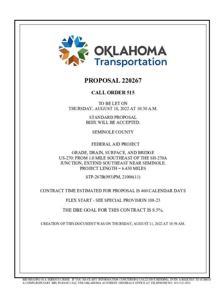 PROPOSAL 220267 CALL ORDER 515 TO BE LET ON THURSDAY, AUGUST 18, 2022, AT 10:30 A.M. STANDARD PROPOSAL BID WILL BE ACCEPTED. SEMINOLE COUNTY FEDERAL AID PROJECT GRADE, DRAIN, SURFACE, AND BRIDGE US270: