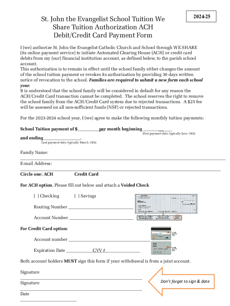 St. John the Evangelist School Tuition We Share Tuition Authorization ACH Debit/Credit Card Payment Form202425I (we) authorize St. John the Evangelist Catholic Church and School through WE SHARE (its