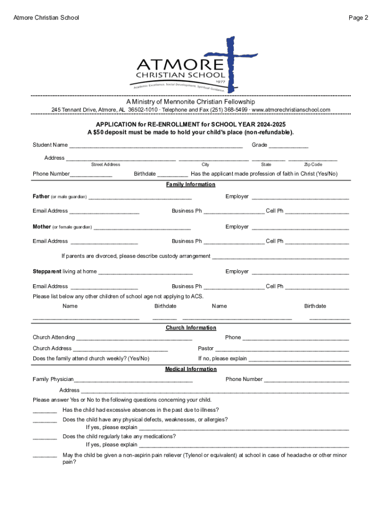245 Pennant Drive, At more, AL 365021010 Telephone and Fax (251) 3685499 www.atmorechristianschool.comAPPLICATION for ENROLLMENT