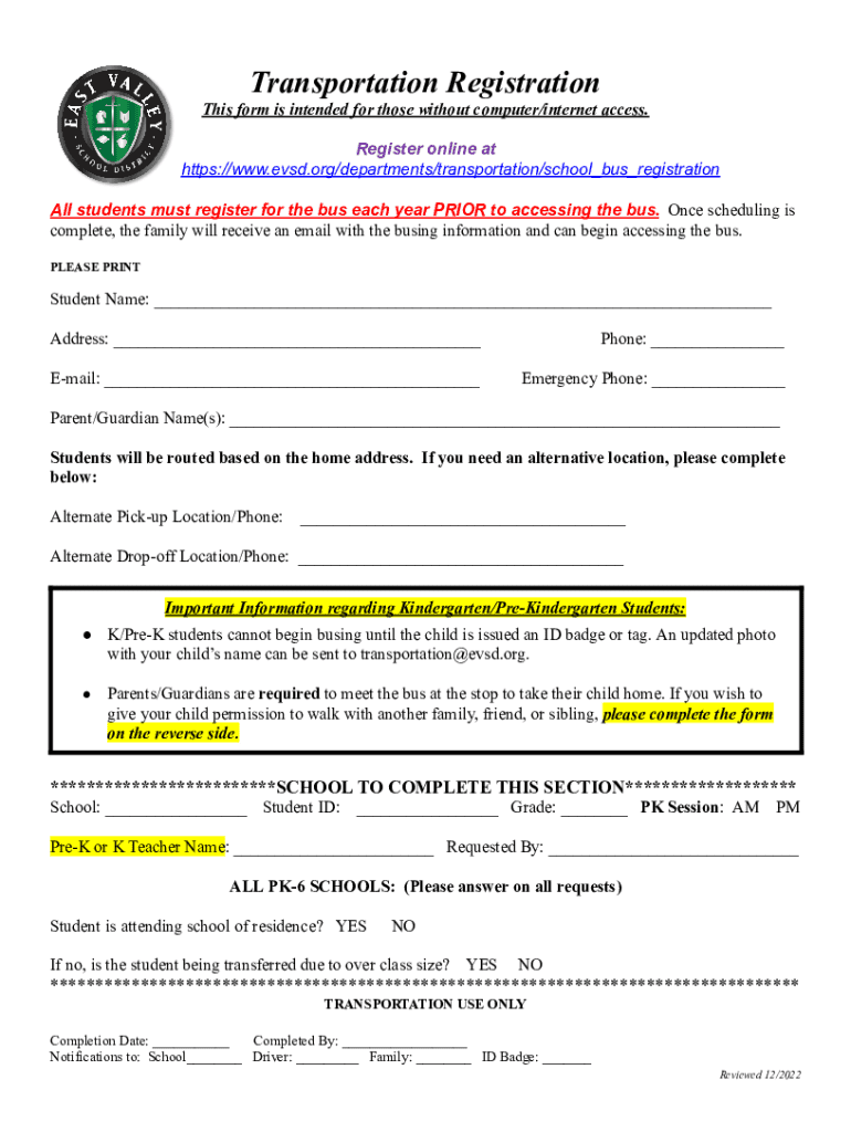Transportation Registration This form is intended for those without computer/internet access. Register online at https://www.evsd.org/departments/transportation/school_bus_registration All students