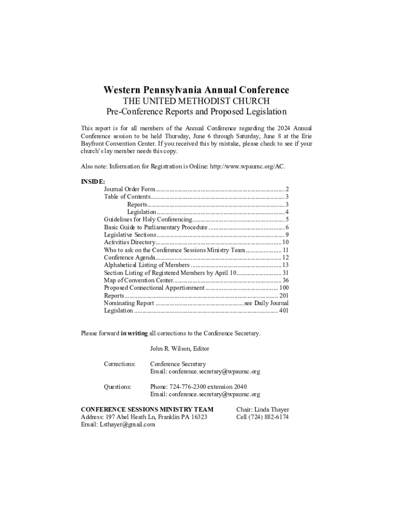 Conference Reports and Proposed Legislations report is for all members of the Annual Conference regarding the 2024 Annual