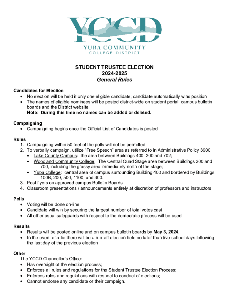 STUDENT TRUSTEE ELECTION 20242025 General Rules Candidates for Election No election will be held if only one eligible candidate; candidate automatically wins position The names of eligible nominees