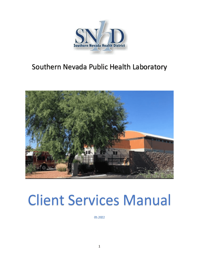 Southern Nevada Public Health LaboratoryClient Services Manual 05.20221Southern Nevada Public Health Laboratory TABLE OF CONTENTS (See appendix A for an alphabetical list of all tests) CONTENT GENERAL