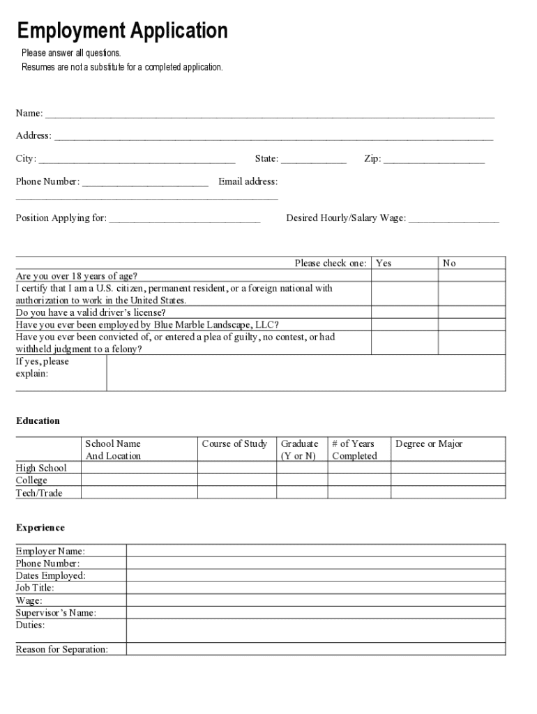 Employment ApplicationPlease answer all questions. Resumes are not a substitute for a completed application.Name: ___ Address: ___ City: ___State: ___Zip: ___Phone Number: ___ Email address: ___ Position