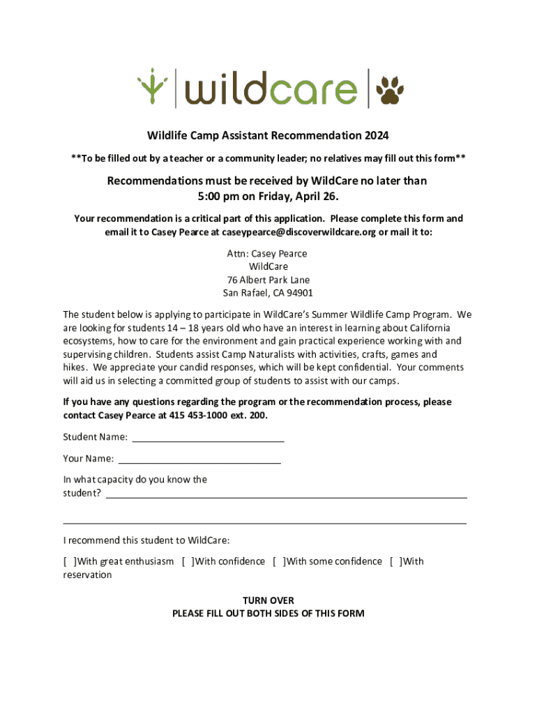 Wildlife Camp Assistant Recommendation 2024