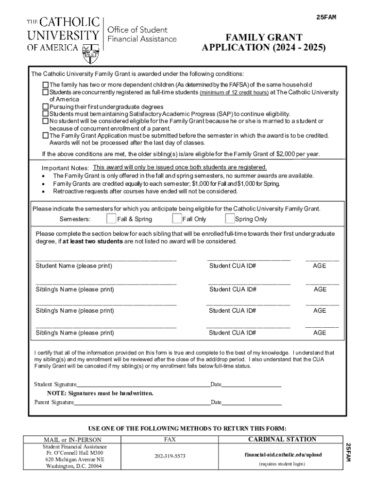 25FAMFAMILY GRANT APPLICATION (2024 2025) The Catholic University Family Grant is awarded under the following conditions: The family has two or more dependent children (As determined by the FAFSA)