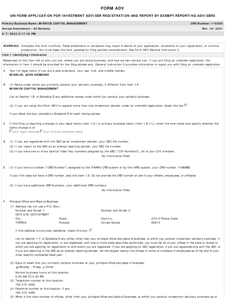 FORM ADV UNIFORM APPLICATION FOR INVESTMENT ADVISER REGISTRATION AND REPORT BY EXEMPT REPORTING ADVISERS Primary Business Name: MINNICK CAPITAL MANAGEMENTCRD Number: 116385Annual Amendment All SectionsRev.