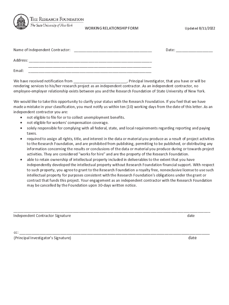 WORKING RELATIONSHIP FORMName of Independent Contractor: ___Updated 8/11/2022Date: ___Address: ___ ___ Email: ___ We have received notification from ___, Principal Investigator, that you have or will