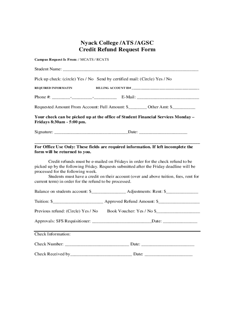 Nyack College /ATS /AGSC Credit Refund Request Form Campus Request Is From: / MCATS / RCATSStudent Name: ___ Pick up check: (circle) Yes / No Send by certified mail: (Circle) Yes / No REQUIRED INFORMATINBILLING