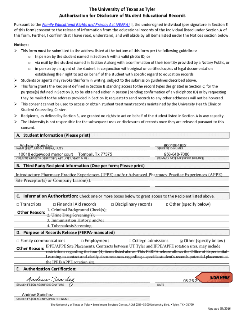 The University of Texas as Tyler Authorization for Disclosure of Student Educational Records Pursuant to the Family Educational Rights and Privacy Act (FERPA), I, the undersigned individual (per signature