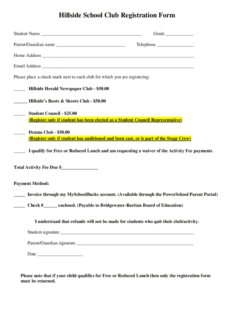 Hillside School Club Registration Form Student Name ___ Parent/Guardian name ___Grade ___Telephone ___Home Address ___ Email Address ___ Please place a check mark next to each club for which you are