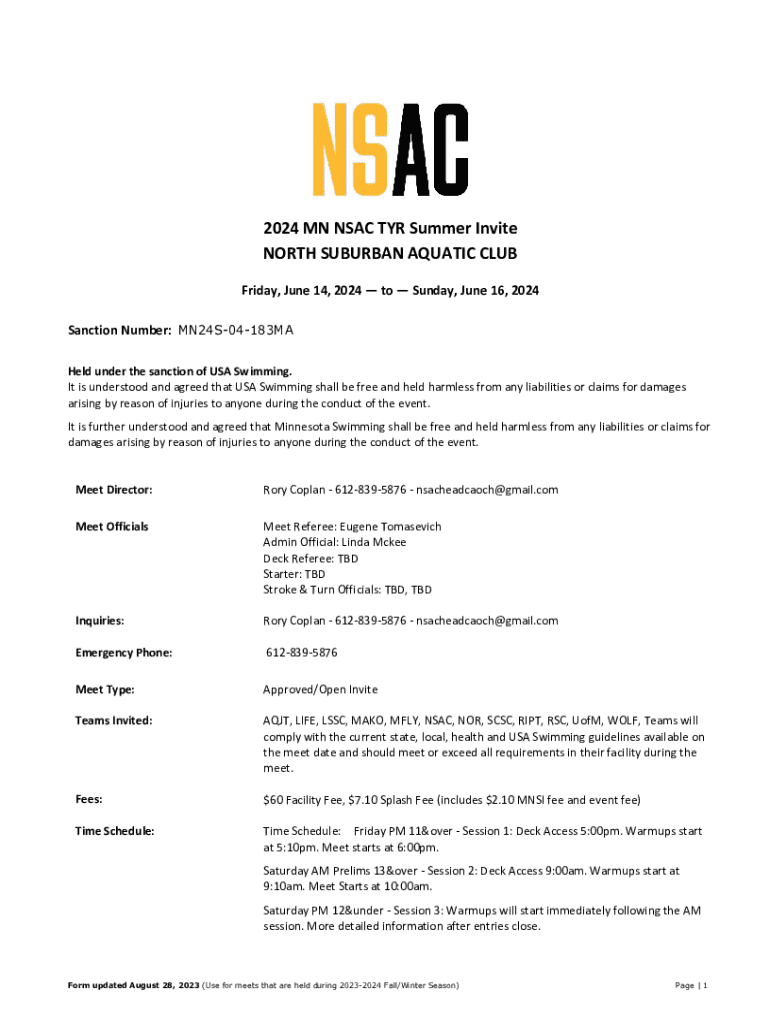 2024 MN NSAC TYR Summer Invite NORTH SUBURBAN AQUATIC CLUB Friday, June 14, 2024 to Sunday, June 16, 2024 Sanction Number: MN24S04183MA Held under the sanction of USA Swimming. It is understood and
