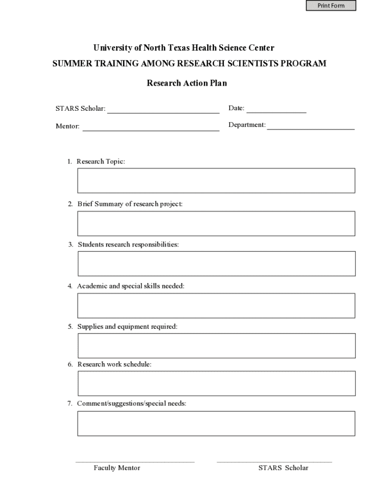 Print Preuniversity of North Texas Health Science Center SUMMER TRAINING AMONG RESEARCH SCIENTISTS PROGRAM Research Action Plan STARS Scholar:Date:Mentor:Department:1. Research Topic:2. Brief Summary