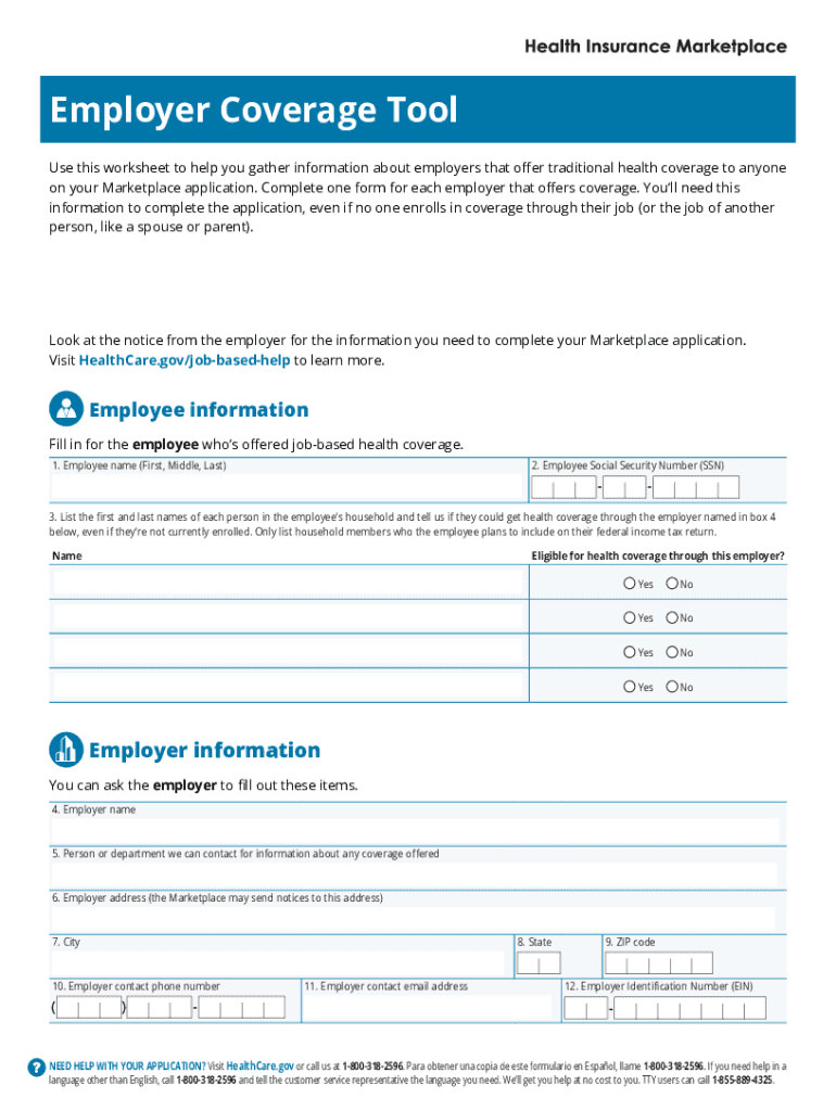 Employer Coverage Tool Use this worksheet to help you gather information about employers that offer traditional health coverage to anyone on your Marketplace application. Complete one form for each