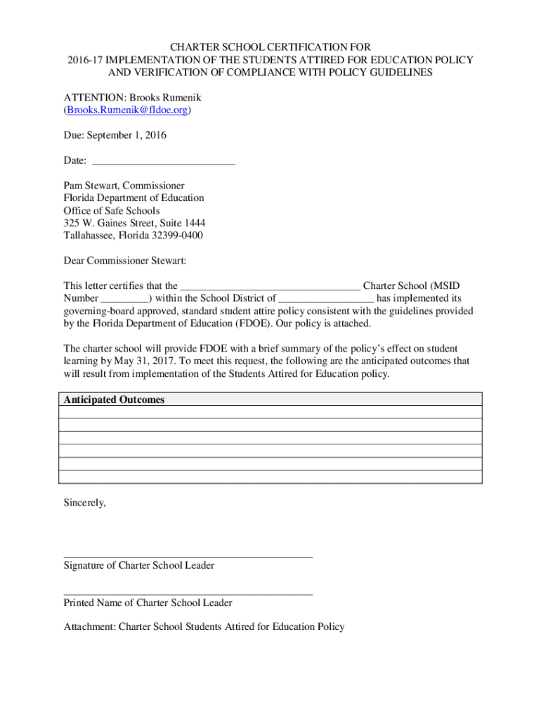CHARTER SCHOOL CERTIFICATION FOR 201617 IMPLEMENTATION OF THE STUDENTS ATTIRED FOR EDUCATION POLICY AND VERIFICATION OF COMPLIANCE WITH POLICY GUIDELINES ATTENTION: Brooks Romania (Brooks.Rumenik@fldoe.org)