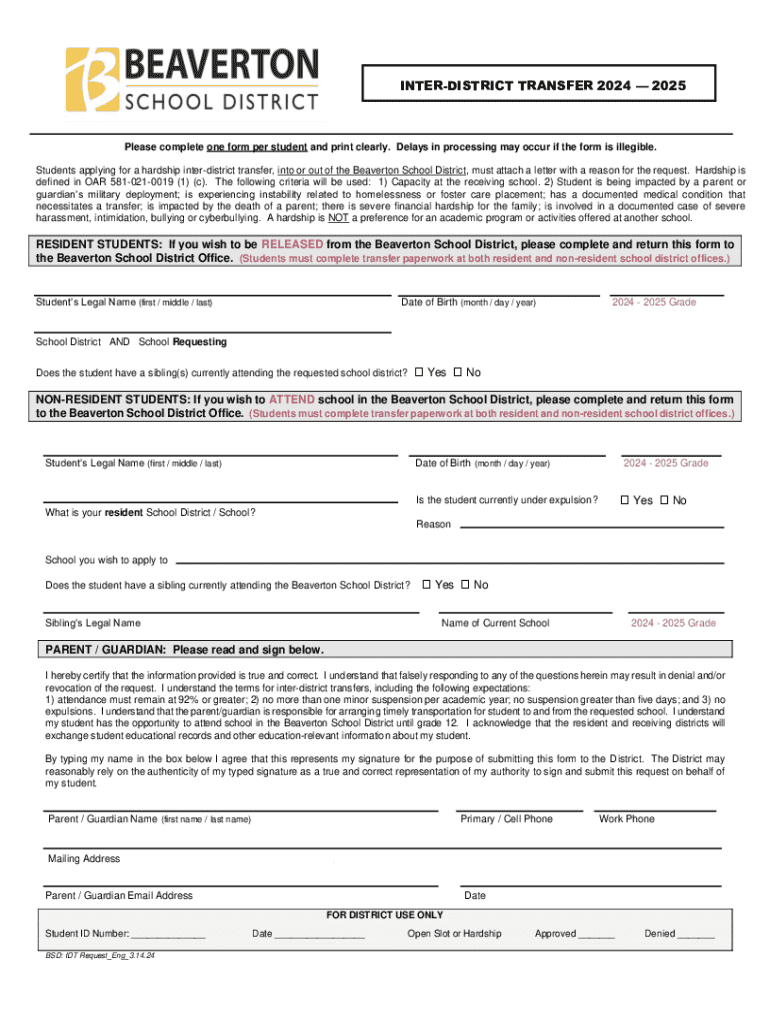 INTERDISTRICT TRANSFER 2024 2025Please complete one form per student and print clearly. Delays in processing may occur if the form is illegible. Students applying for a hardship interdistrict transfer,
