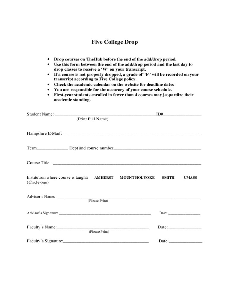 Sample five college drop can be filled out by providing information about the course, reason for dropping, and obtaining required signatures.