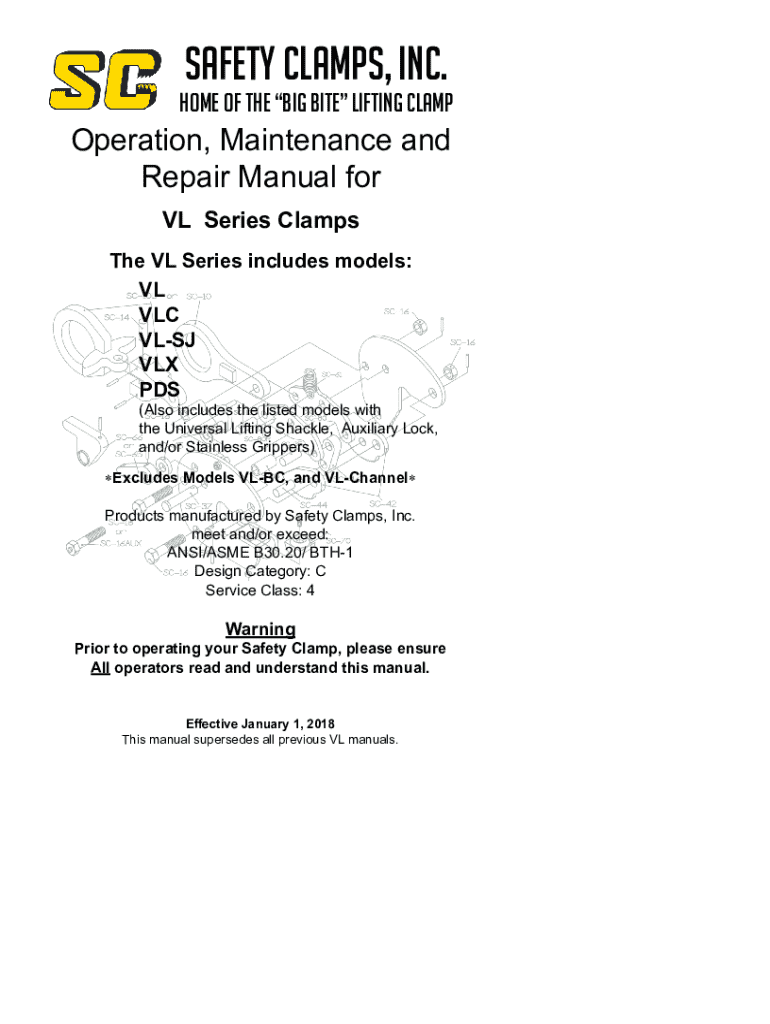 Safety clamps, inc.Home of the big Bite Lifting ClampOperation, Maintenance and Repair Manual for VL Series Clamps The VL Series includes models: VL VLC VLSJ VLX PDS (Also includes the listed models