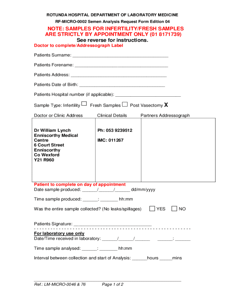 RFMICRO0002 Semen Analysis Request Form Edition 04NOTE: SAMPLES FOR INFERTILITY/FRESH SAMPLES