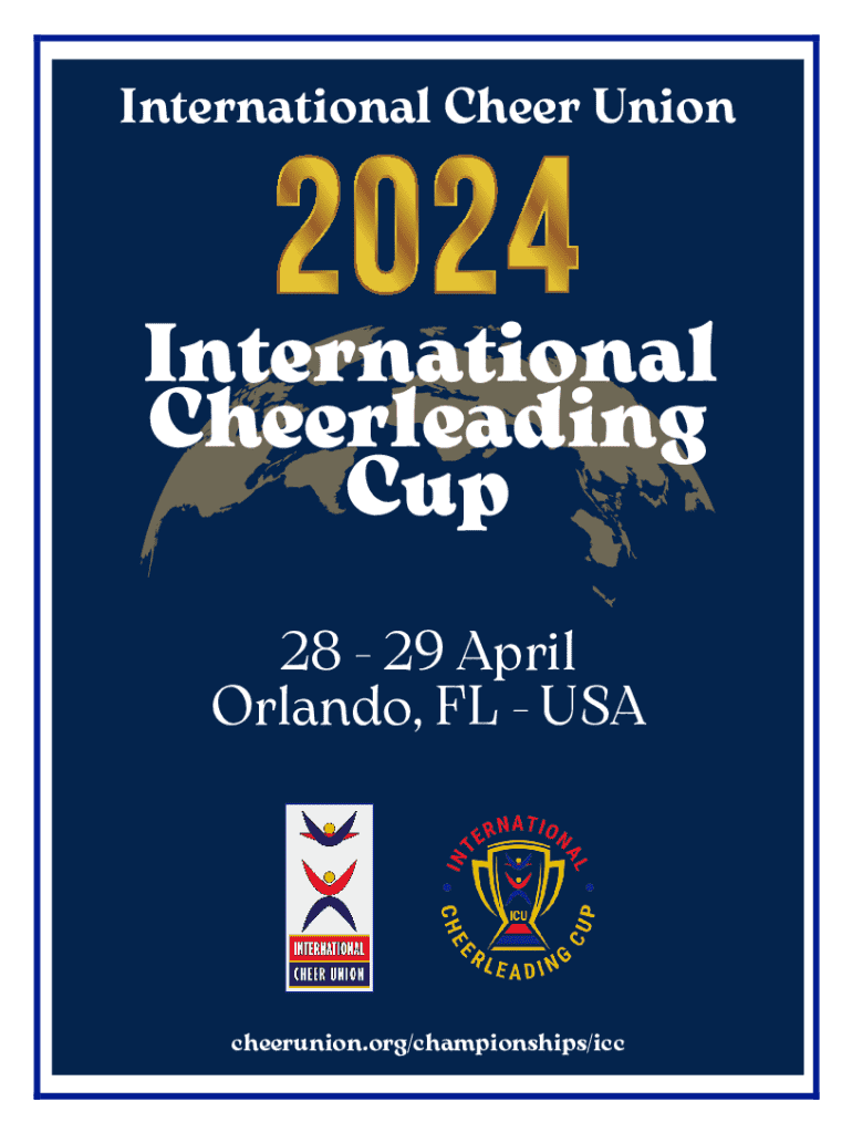International Cheer UnionInternational Cheerleading Cup 28 29 April Orlando, FL USAcheerunion.org/championships/iccICU INTERNATIONAL CHEERLEADING CUP 2024 (For Individual Club Teams Not National Teams)ABOUT
