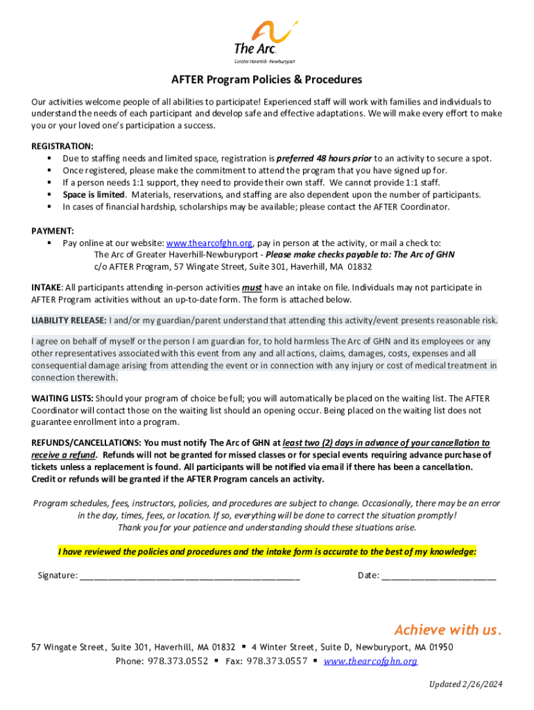 AFTER Program Policies & Procedures Our activities welcome people of all abilities to participate! Experienced staff will work with families and individuals to understand the needs of each participant