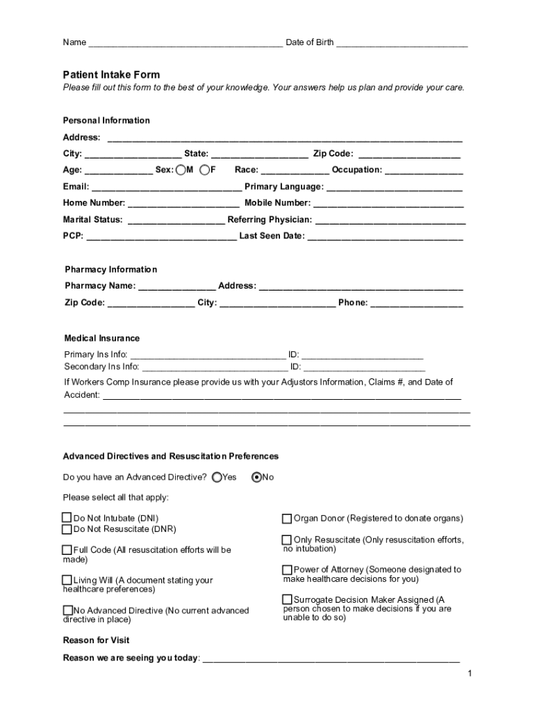 Name ___ Date of Birth ___Patient Intake Form Please fill out this form to the best of your knowledge. Your answers help us plan and provide your care.Personal Information Address: ___ City: ___ State:
