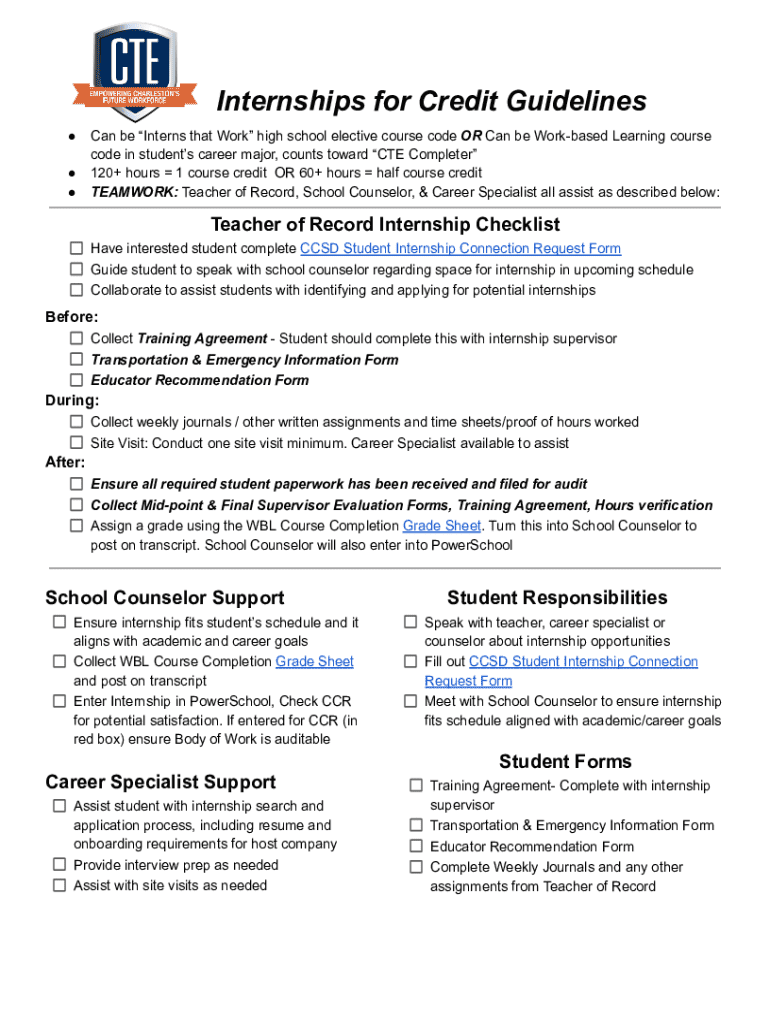 Internships for Credit Guidelines Can be Interns that Work high school elective course code OR Can be Workbased Learning course code in students career major, counts toward CTE Completer 120+ hours