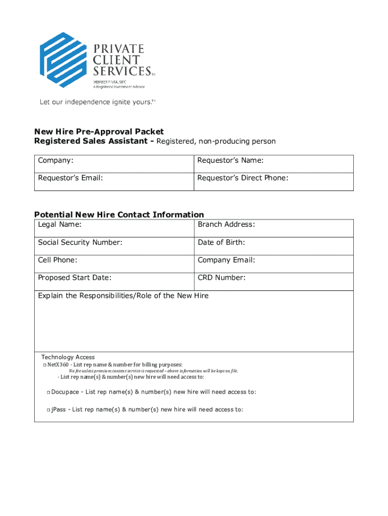 New Hire PreApproval Packet Registered Sales Assistant Registered, nonproducing person Company:Requestors Name:Requestors Email:Requestors Direct Phone:Potential New Hire Contact Information Legal