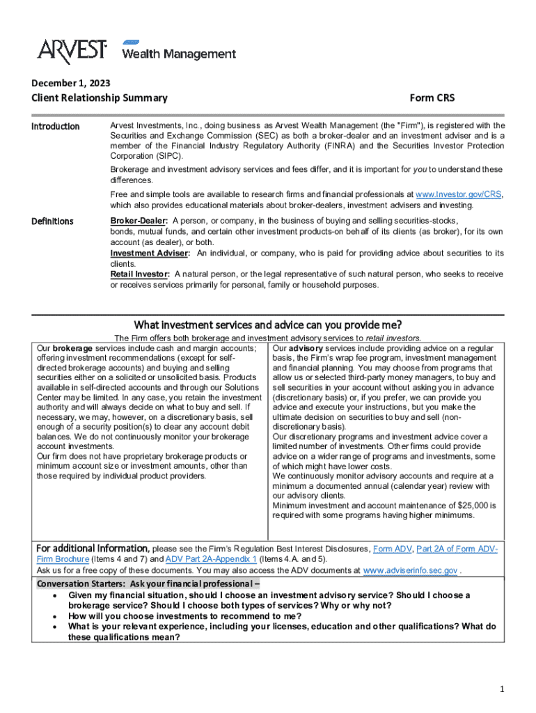 IntroductionForm Harvest Investments, Inc., doing business as Arrest Wealth Management (the \”Firm\”), is registered with the