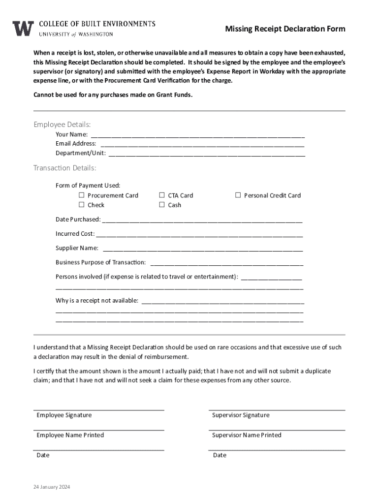 Missing Receipt Declaration Form