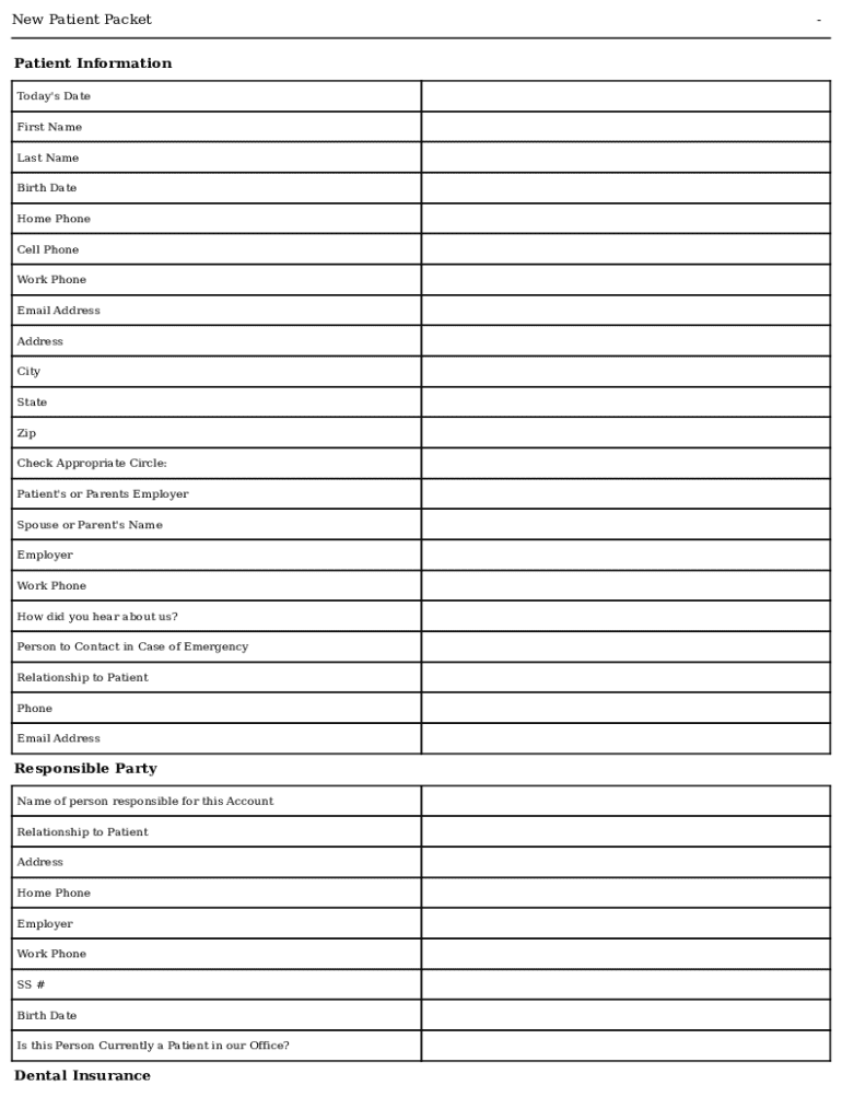 New Patient Packet Patient Information Today\'s Date First Name Last Name Birth Date Home Phone Cell Phone Work Phone Email Address Address City State Zip Check Appropriate Circle: Patient\'s or Parents
