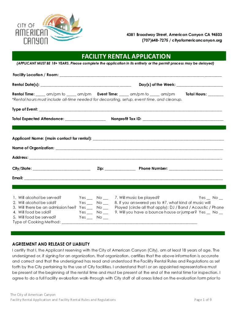 4381 Broadway Street, American Canyon CA 94503 (707)6487275 / cityofamericancanyon.orgFACILITY RENTAL APPLICATION (APPLICANT MUST BE 18+ YEARS. Please complete the application in its entirety or the