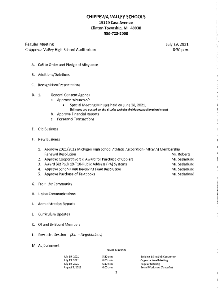 CHIPPEWA VALLEY SCHOOLS 19120 Class Avenue Clinton Township, Ml 48038 5867232000Regular Meeting Chippewa Valley High School Auditorium July 19, 2021 6:30p.m.A. Call to Order and Pledge of Allegiance