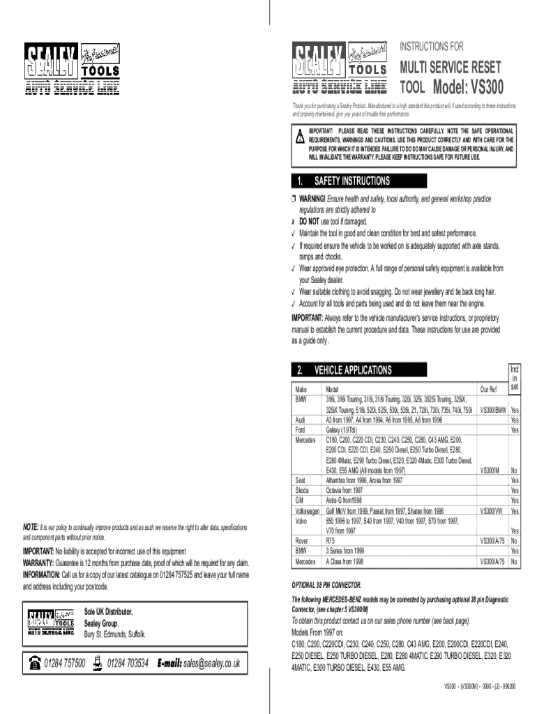 TOOL Model: VS300Thank you for purchasing a Sealed Product. Manufactured to a high standard this product will, if used according to these instructions