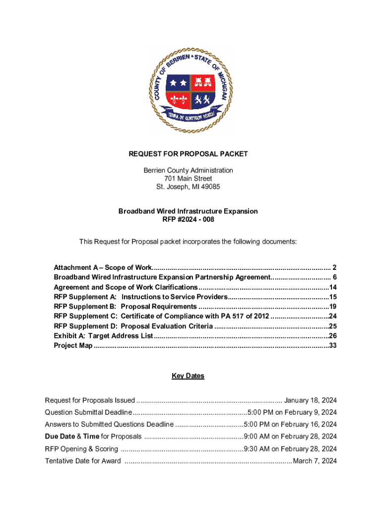 REQUEST FOR PROPOSAL PACKET Berries County Administration 701 Main Street St. Joseph, MI 49085 Broadband Wired Infrastructure Expansion RFP #2024 008 This Request for Proposal packet incorporates