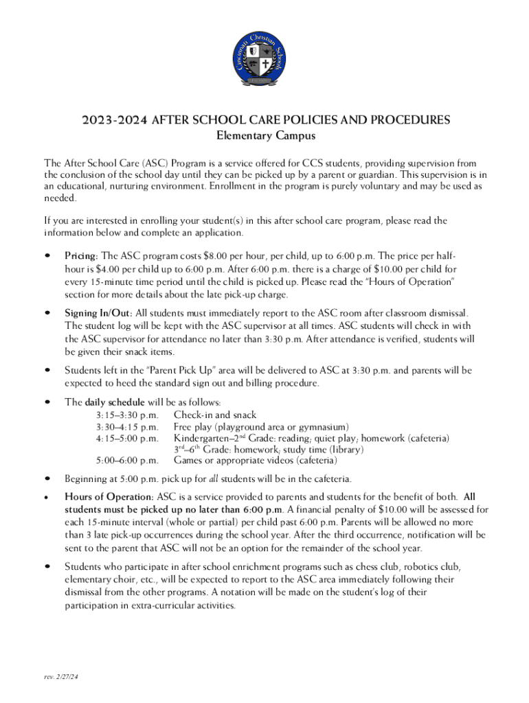 20232024 AFTER SCHOOL CARE POLICIES AND PROCEDURES Elementary Campus The After School Care (ASC) Program is a service offered for CCS students, providing supervision from the conclusion of the school