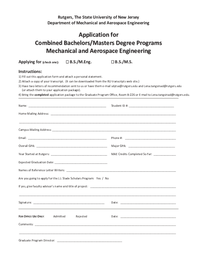 Rutgers, The State University of New Jersey Department of Mechanical and Aerospace EngineeringApplication for Combined Bachelors/Masters Degree Programs Mechanical and Aerospace Engineering Applying