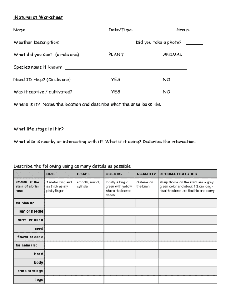 Naturalist Worksheet Name:Date/Time:Weather Description:Group: Did you take a photo? ___What did you see? (circle one)PLANTANIMALSpecies name if known: ___ Need ID Help? (Circle one)Bestows it captive