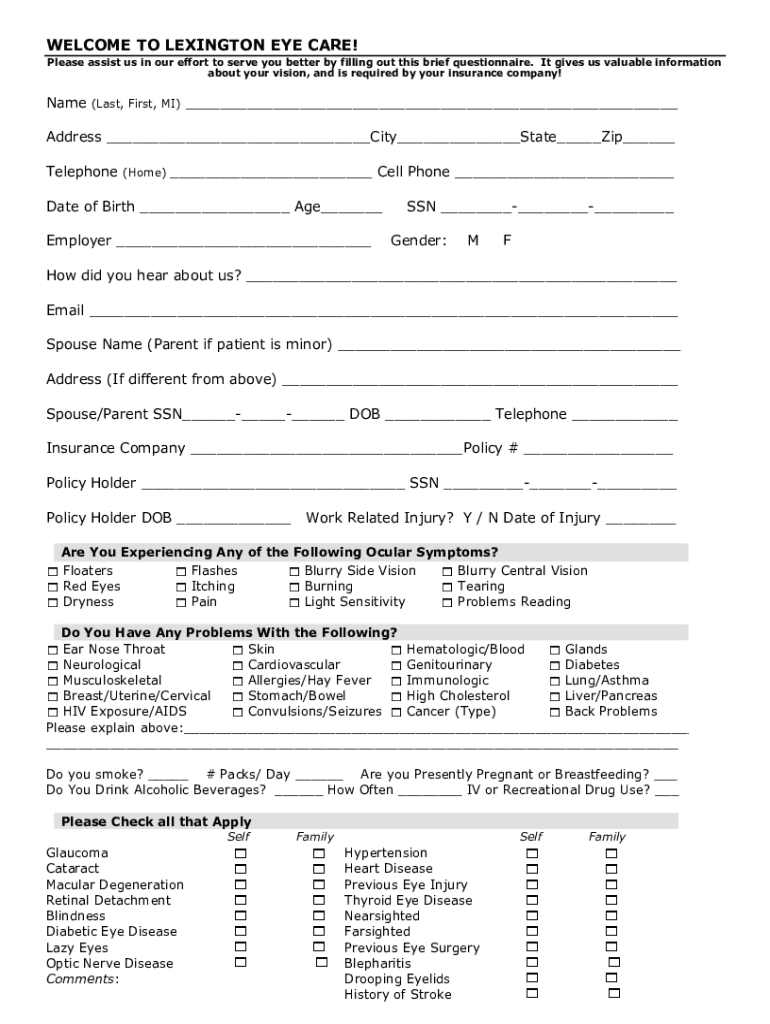 WELCOME TO LEXINGTON EYE CARE! Please assist us in our effort to serve you better by filling out this brief questionnaire. It gives us valuable information about your vision, and is required by your