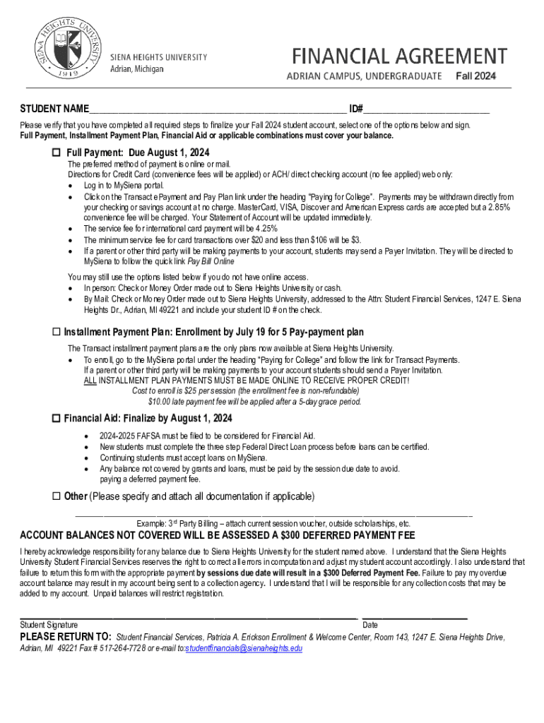 Fall 2024STUDENT NAME___ ID#___ Please verify that you have completed all required steps to finalize your Fall 2024 student account, select one of the options below and sign. Full Payment, Installment