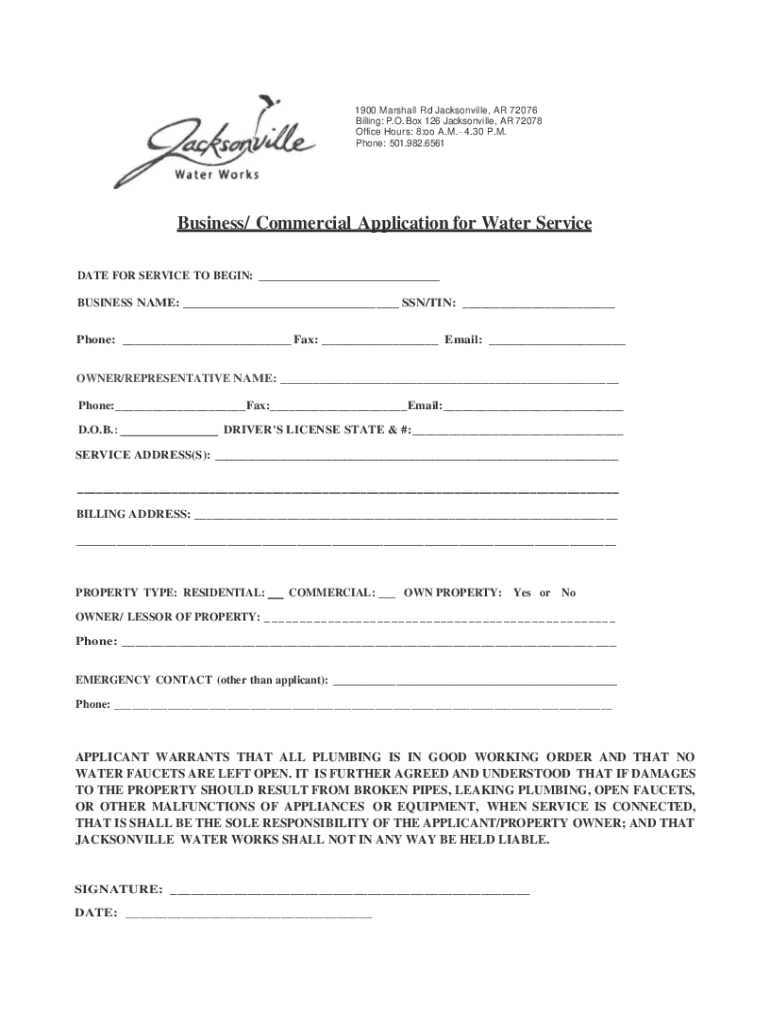 1900 Marshall Rd Jacksonville, AR 72076 Billing: P.O. Box 126 Jacksonville, AR 72078 Office Hours: 8:OO A.M. 4.30 P.M. Phone: 501.982.6561Business/ Commercial Application for Water Service DATE FOR