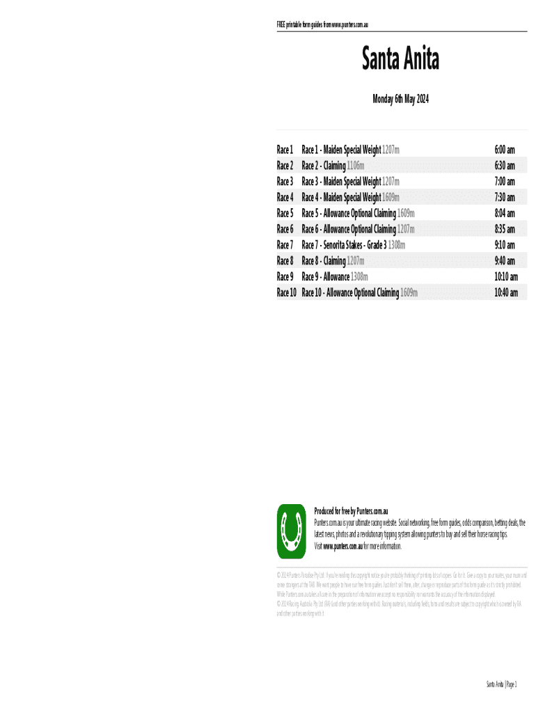FREE printable form guides from www.punters.com.auSanta Anita Monday 6th May 2024Race 1 Race 2 Race 3 Race 4 Race 5 Race 6 Race 7 Race 8 Race 9 Race 10Race 1 Maiden Special Weight 1207m Race 2 Claiming